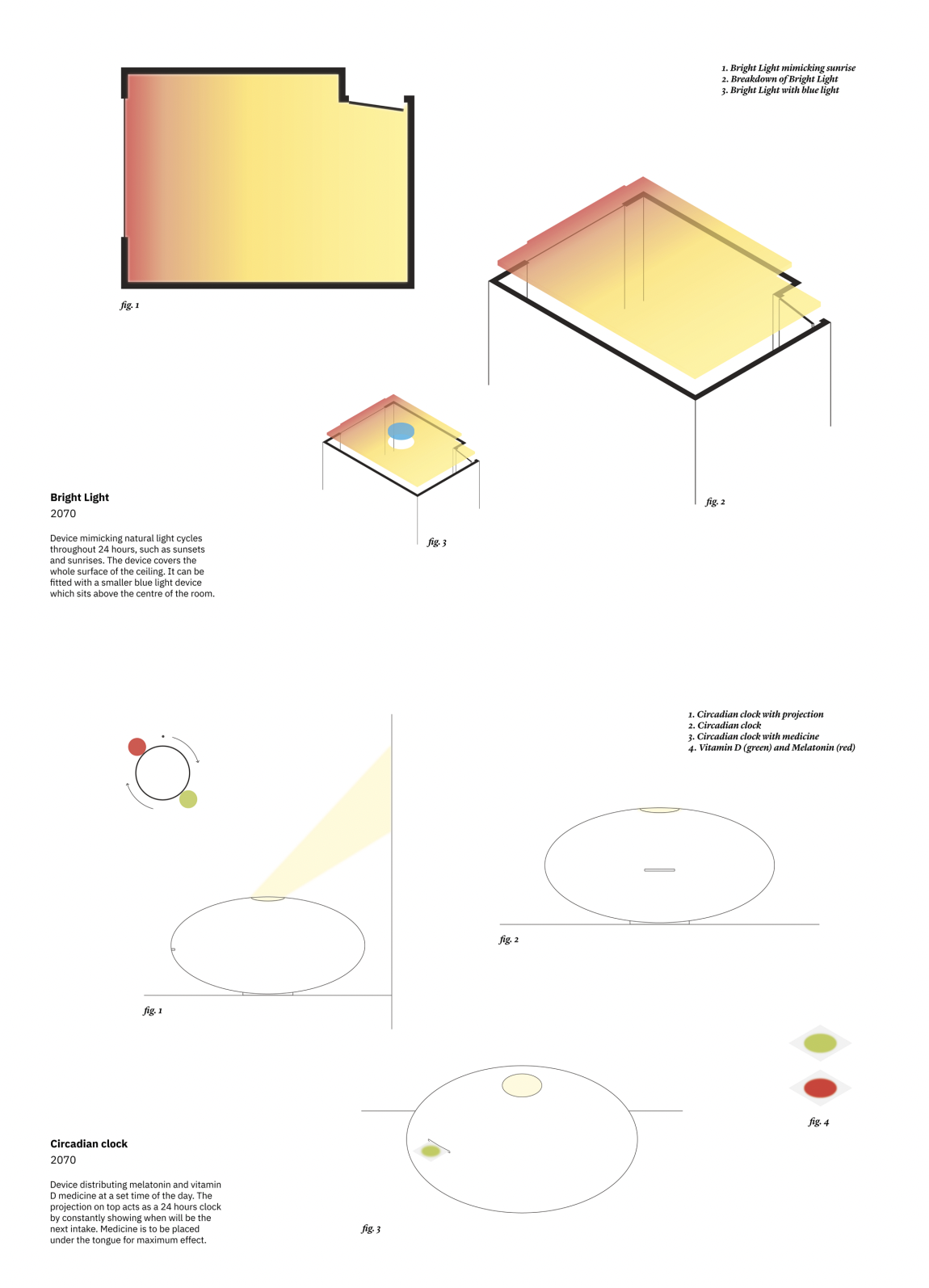 The second presents where objects should be placed for optimal usage. Blue light becomes a centrepiece for any room, while circadian clocks should be in the periphery of a room.